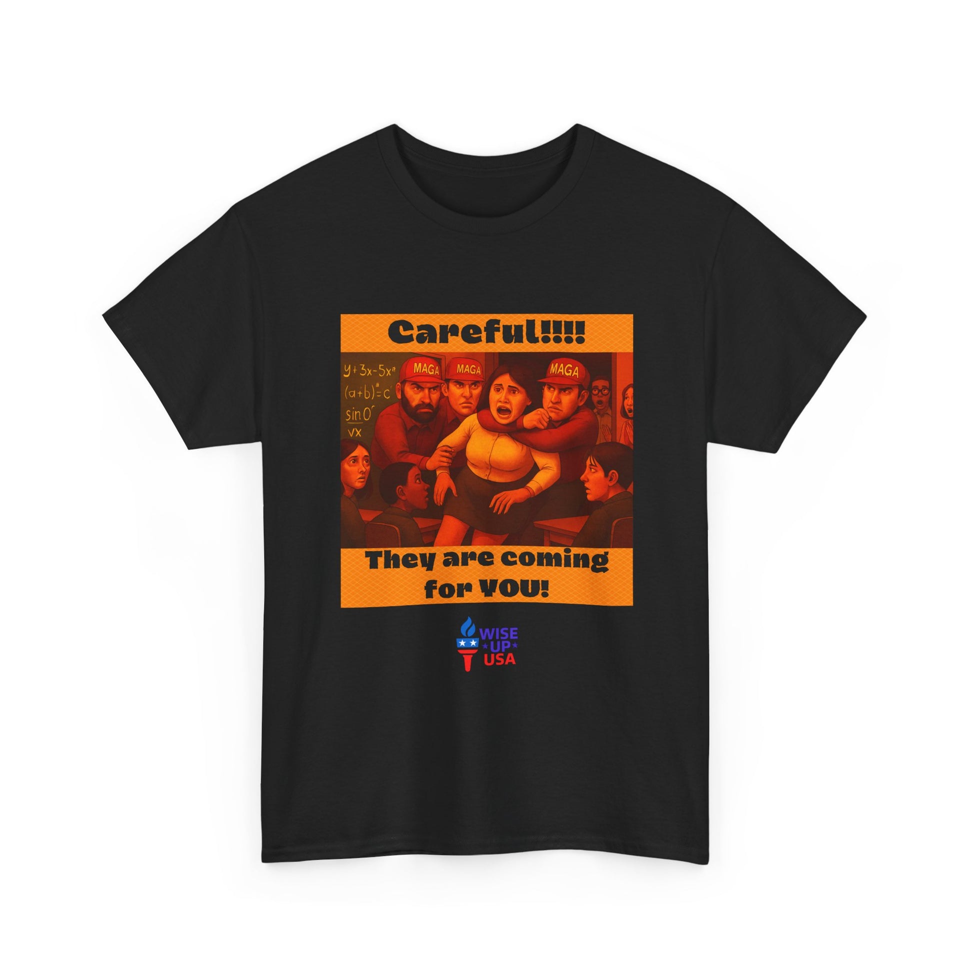 This T-Shirt features a bold design Careful, They are coming for You! making it a perfect Election Day Apparel for activists. It is a great gift for politically conscious individuals looking to make a statement against Trump, Republicans, and MAGA. The tee is a symbol of resistance and activism, fitting perfectly into the wardrobe of those who are passionate about social and political issues. Relevant for Election Day, political rallies, protests, and activism events. Ideal for adults.