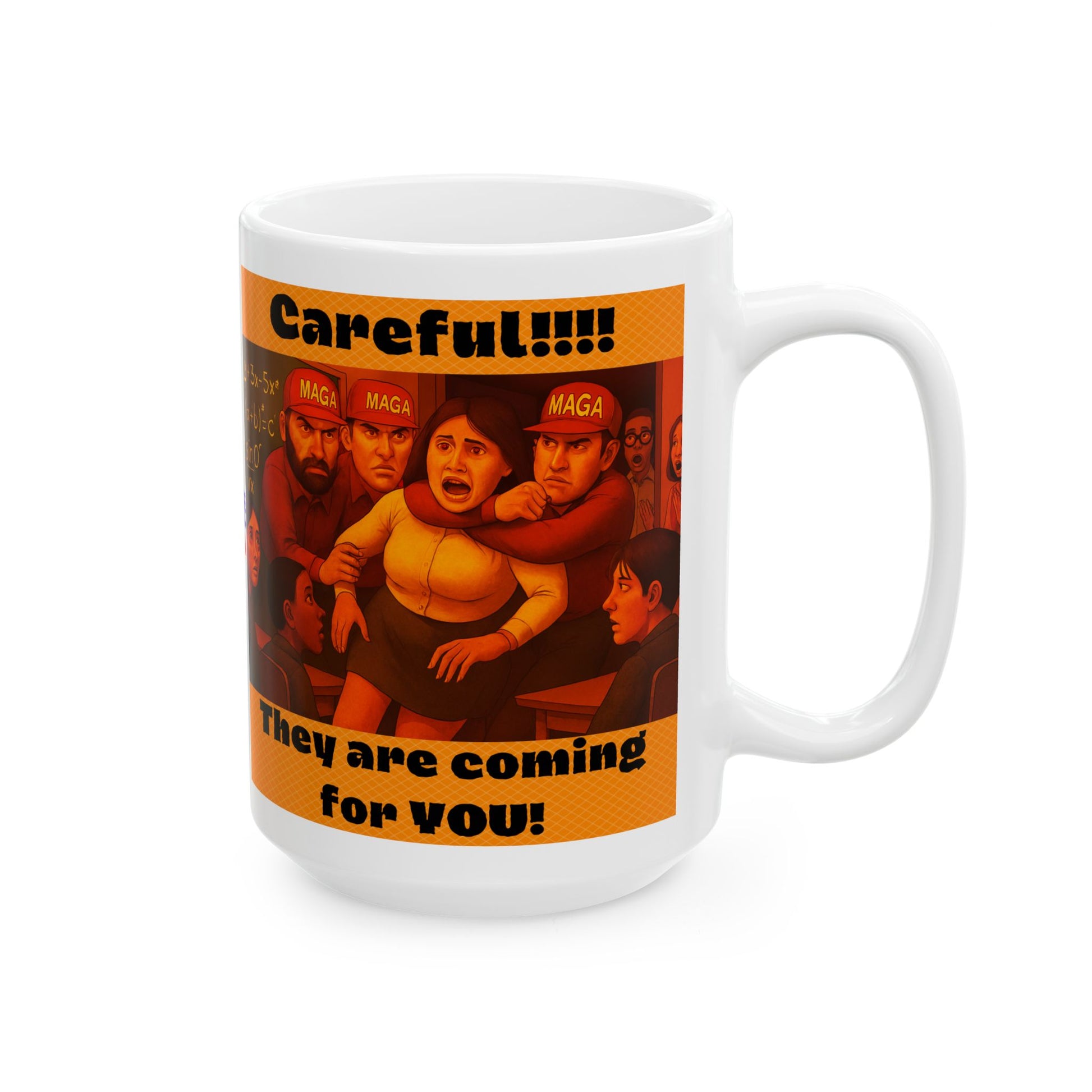 This ceramic mug features a Careful Teacher! design, perfect for election decor and warning America to not back down or our ideals will disappear, a great gift for activists during the Midterms 26. The glossy finish and vibrant colors make this mug stand out, suitable for daily use by those passionate about politics and making a change in the USA.