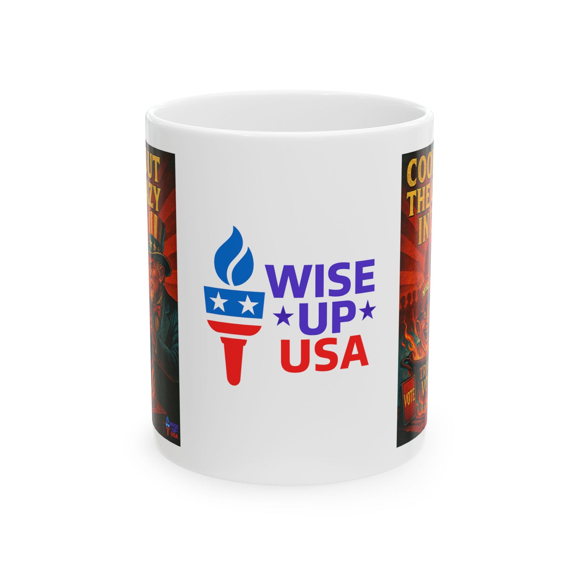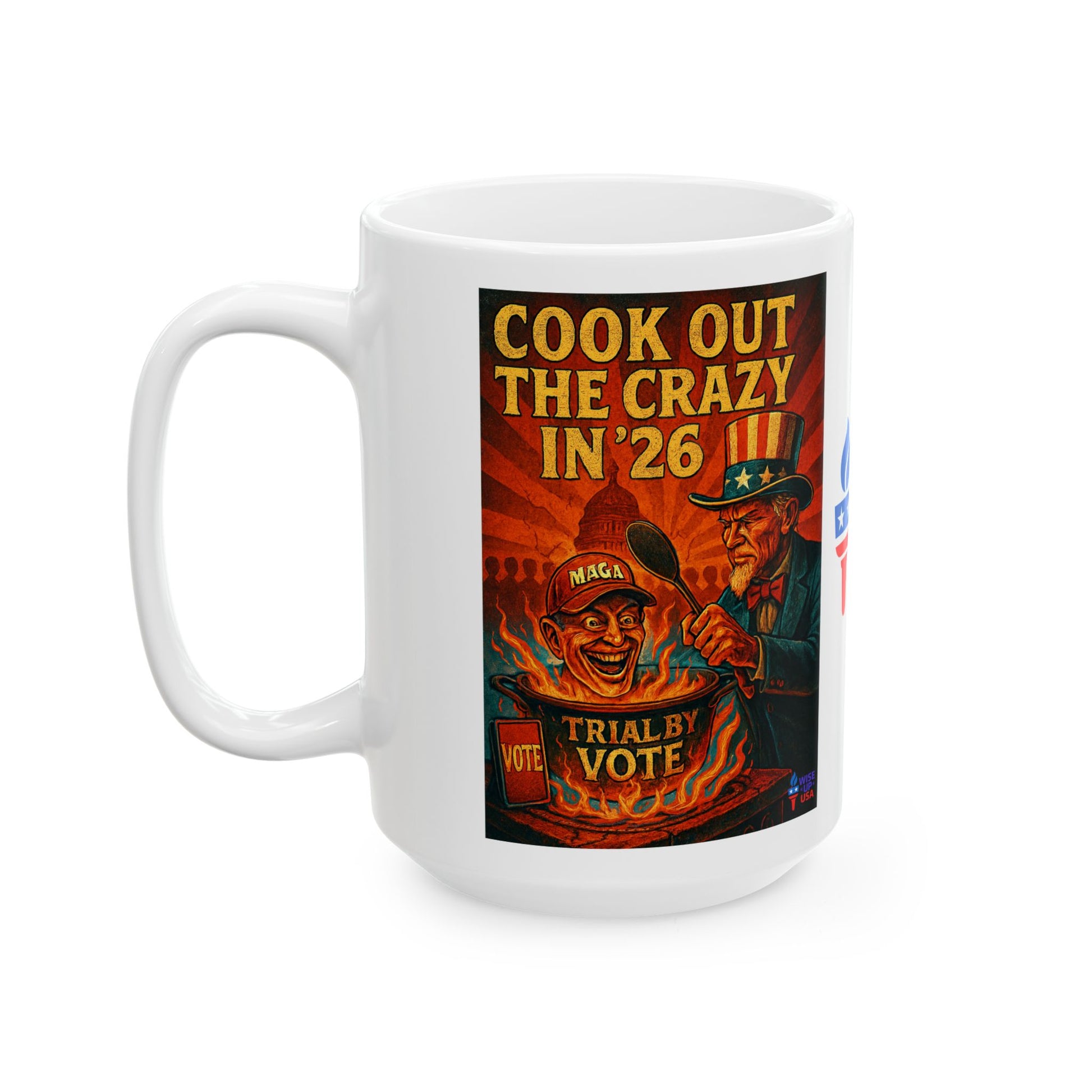 This ceramic mug features a Cook Out the Crazy in 26 design, perfect for election decor and a great gift for activists during the Midterms 26. The glossy finish and vibrant colors make this mug stand out, suitable for daily use by those passionate about politics and making a change in the USA.