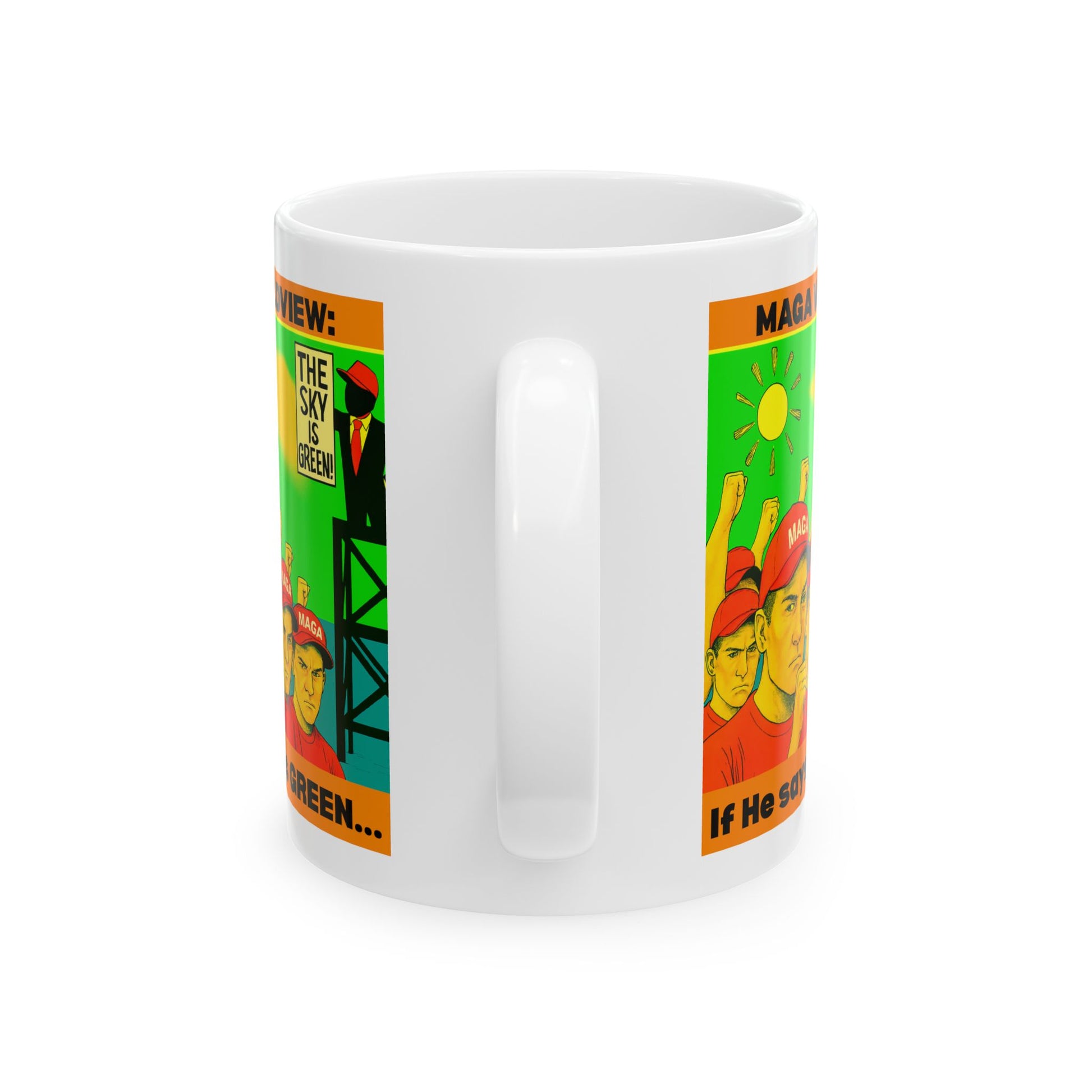 This ceramic mug features Sky is Green design, perfect for election decor and warning America to not back down or our ideals will disappear, a great gift for activists during the Midterms 26. The glossy finish and vibrant colors make this mug stand out, suitable for daily use by those passionate about politics and making a change in the USA.