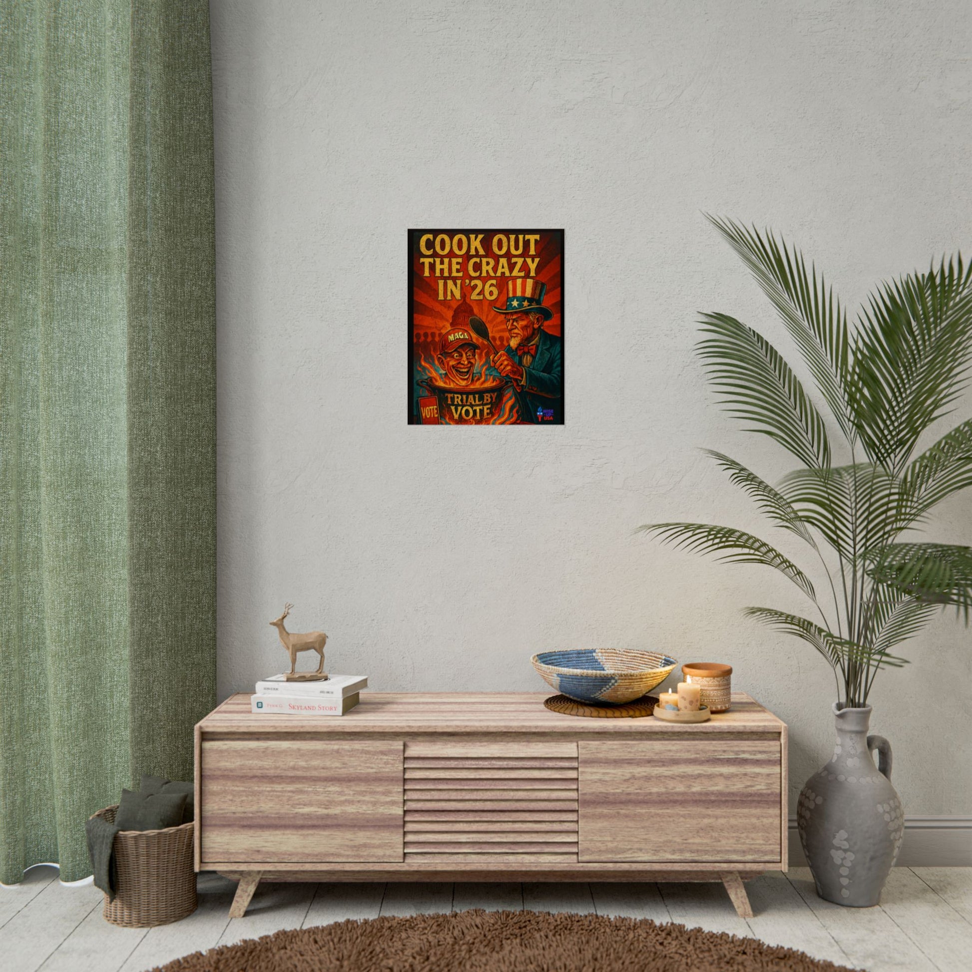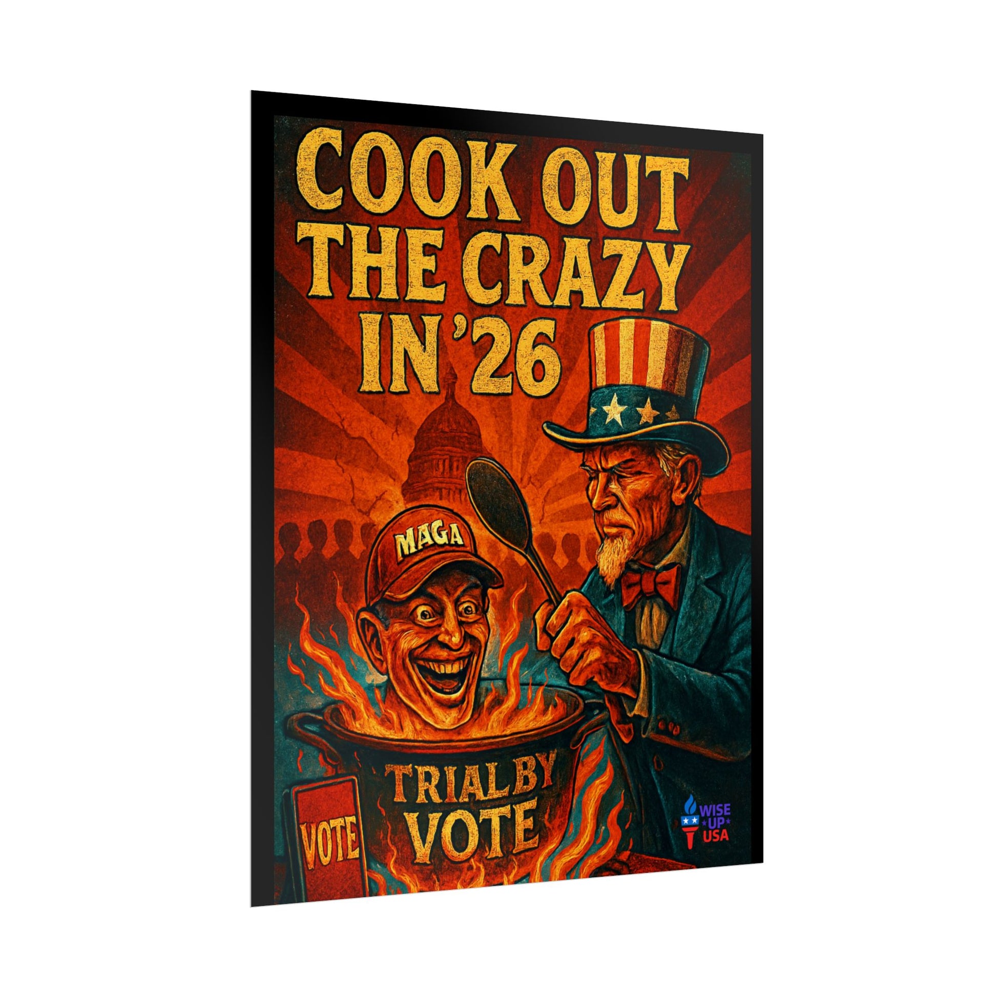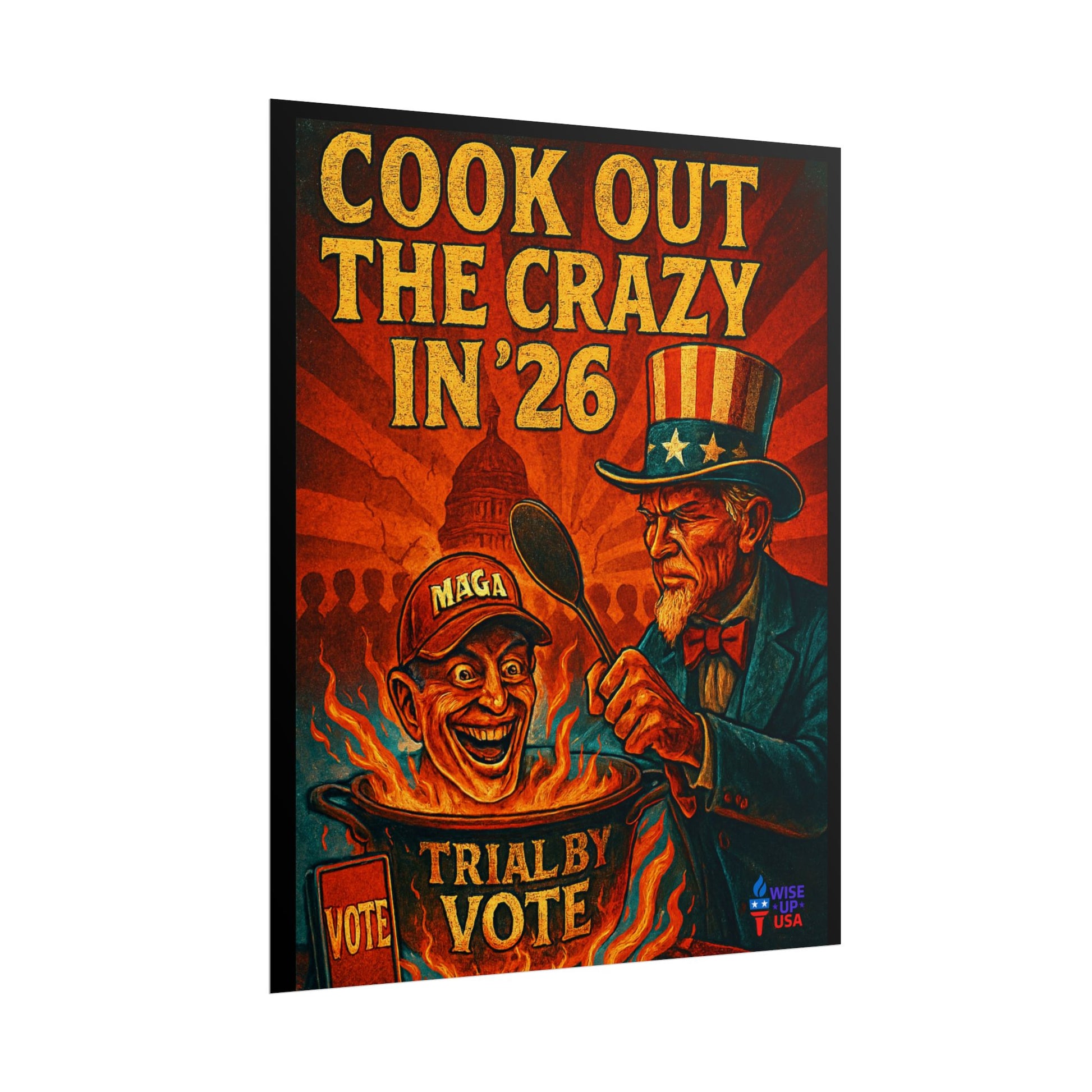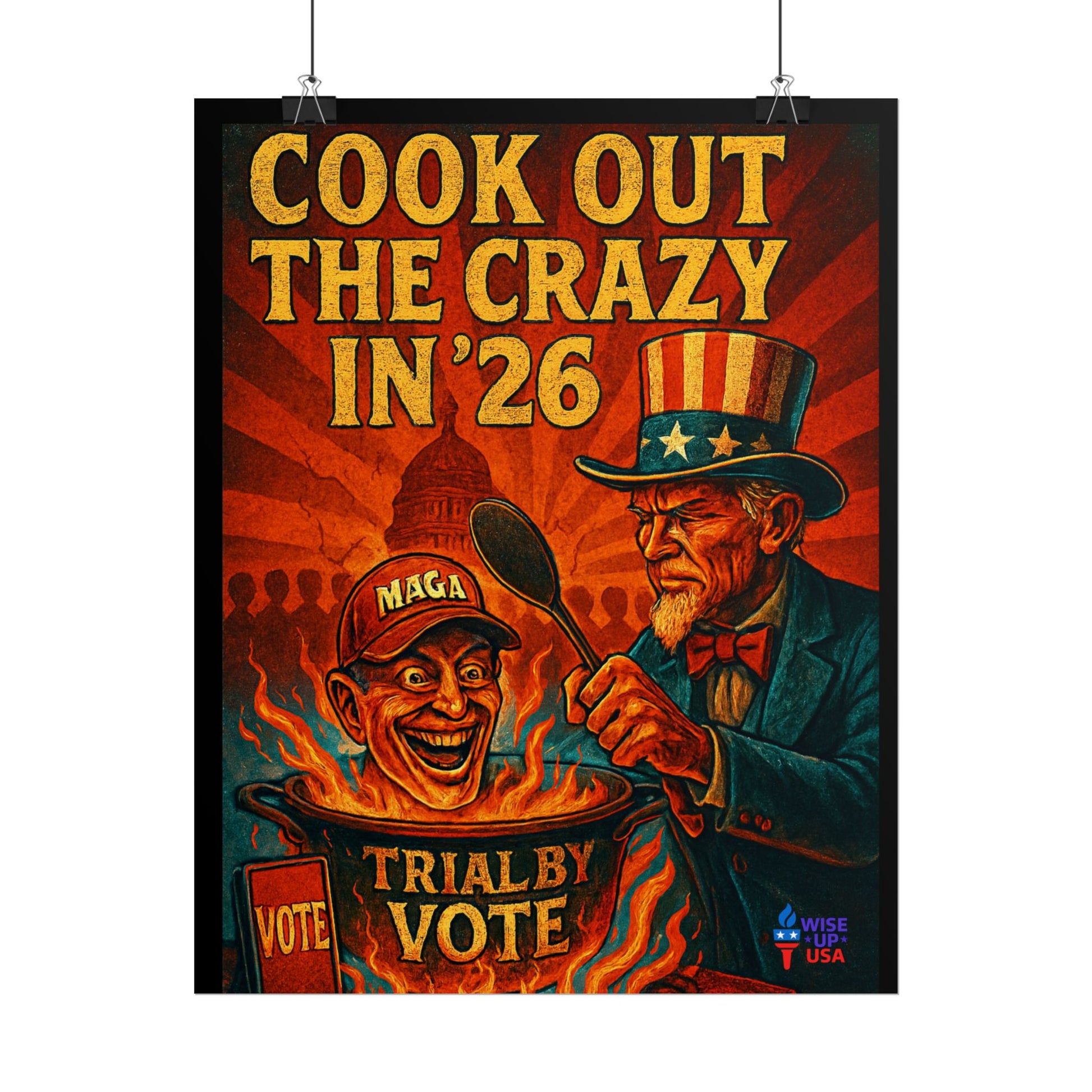 A protest poster designed to encourage Americans to vote the crazy MAGA people out of power in 2026. This poster exudes a powerful and bold message, perfect for activists and politically-conscious individuals. Ideal for hanging in dorm rooms, offices, or community spaces. Relevant for election season, political activism, and protest movements.