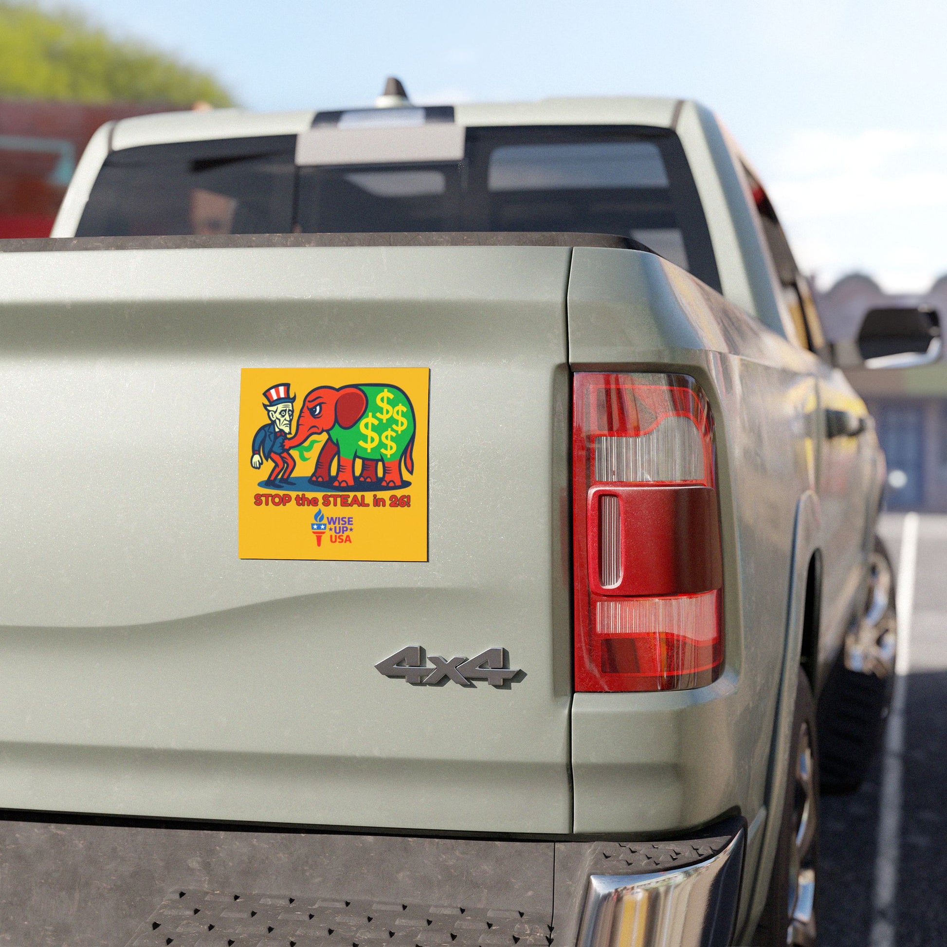 Political Car Magnet featuring a 'Stop the Steal' humor design, perfect for election decor and Wise Up USA activists. This fun vehicle accessory adds a touch of personality to your car, making it a great gift for those passionate about politics and gearing up for the midterms 26. Relevant for Election Day, political rallies, and political events.