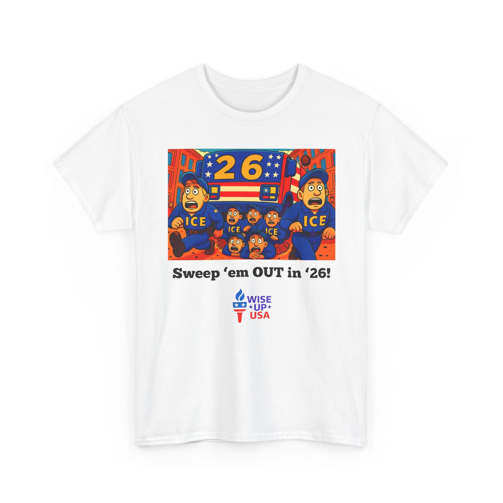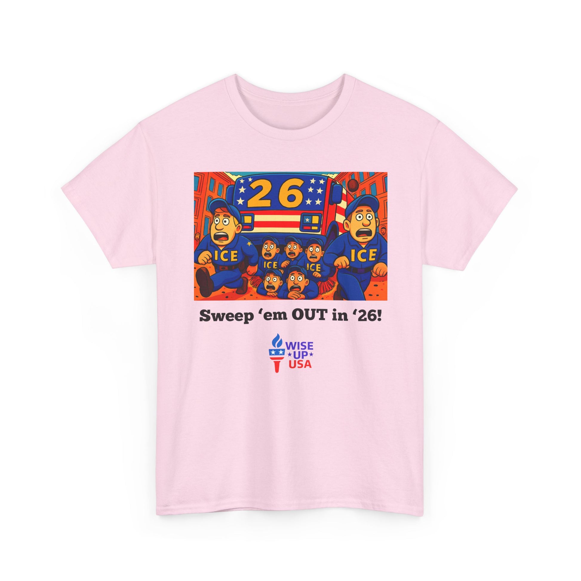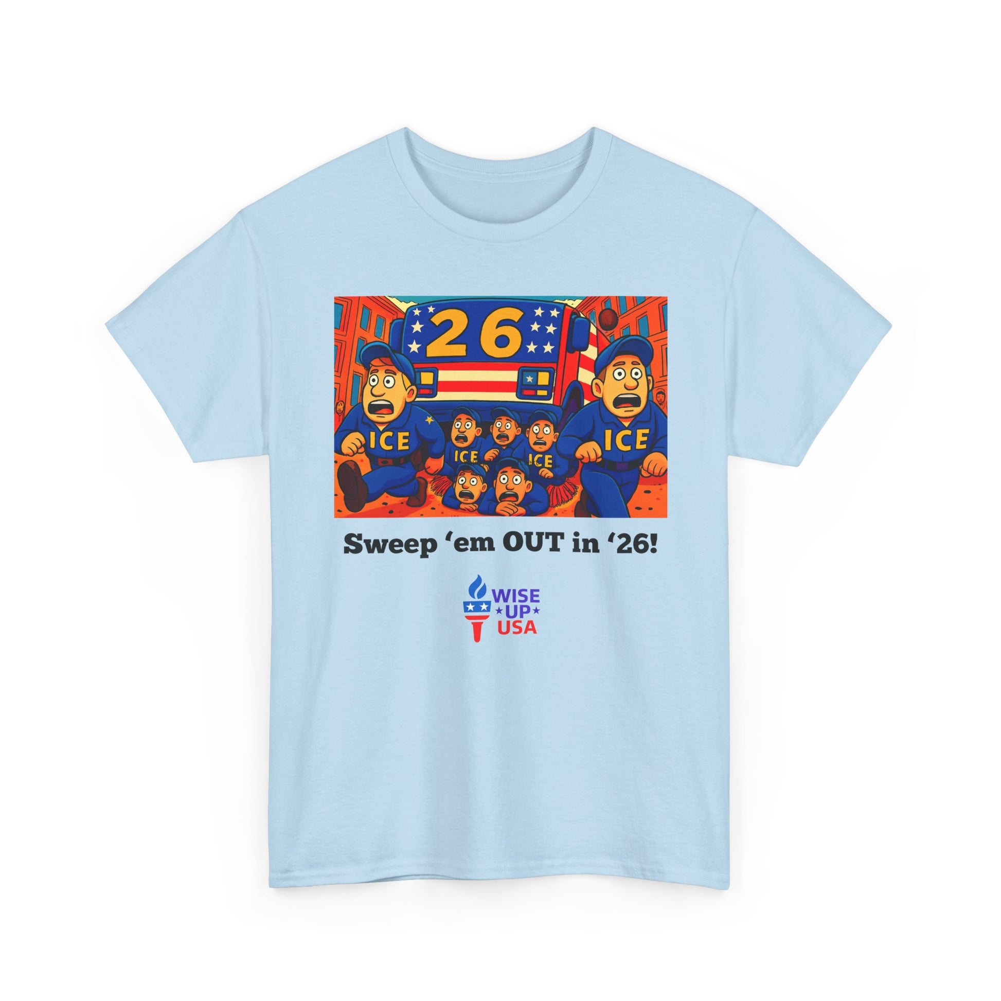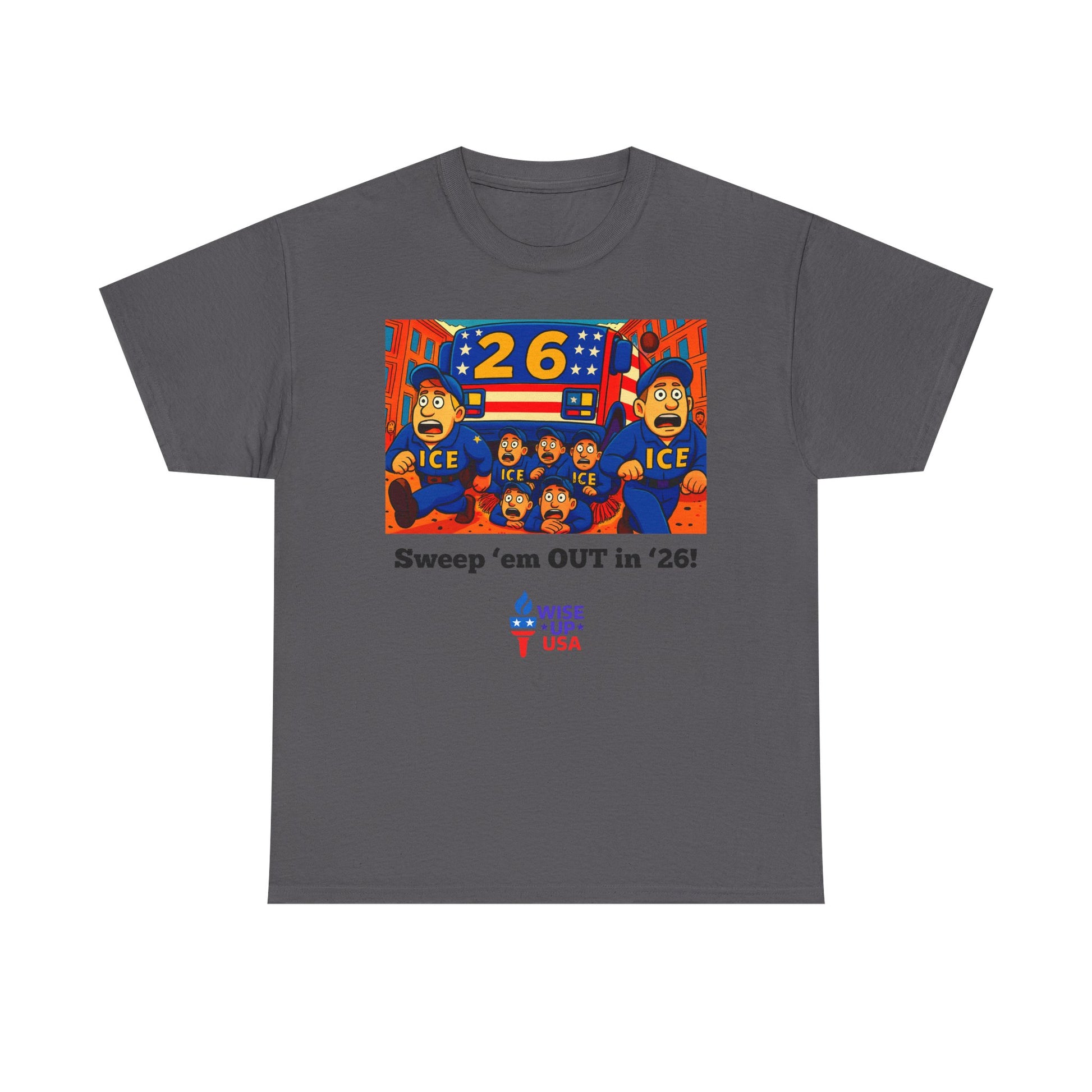 Unisex Heavy Cotton Tee with Patriotic 'Sweep'em OUT in '26!", Design, Election Day Apparel, OUT with ICE, Activists, Midterm 26, Revolution
